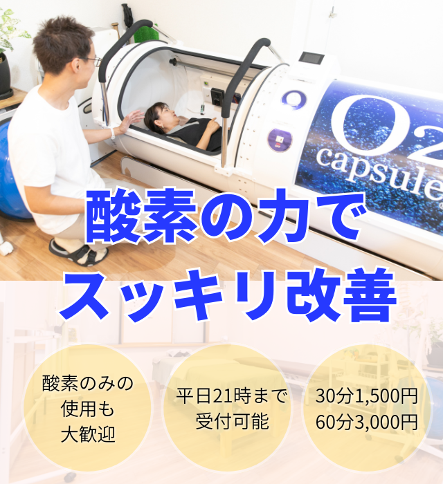 高気圧酸素カプセルに入ることで酸素を十分に蓄えることができます。